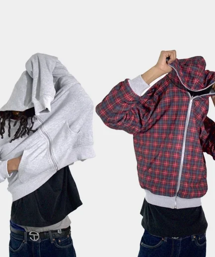 Loose square Fitting Heavyweight Acid Washed Vintage Reversible Jacket Men’s Checkered Hoodie