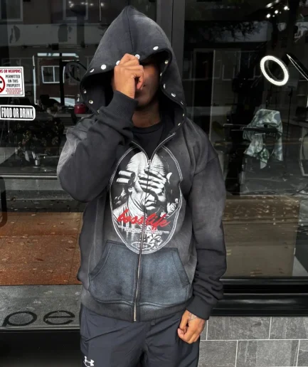 • Men's Designer Fashion Hoodie Heavyweight Printed Retro Unisex Acid Washed Distressed Old Zipper Hoodie