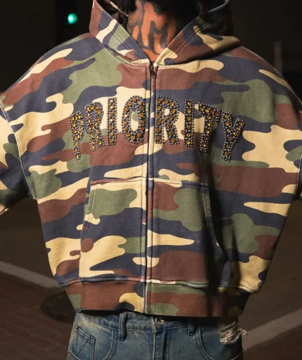 • Men's Camo Streetwear Hoodie Heavyweight Oversized Screen Print Rhinestone Embroidery Boxy Fit Crop Length Hoodie