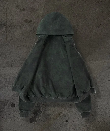 Luxury Men’s Designer Hooded Streetwear with Vintage Print, Oversized Acid Washed Sun Faded Distressed Zipper Jacket
