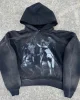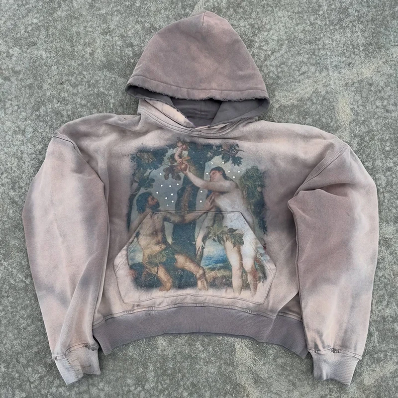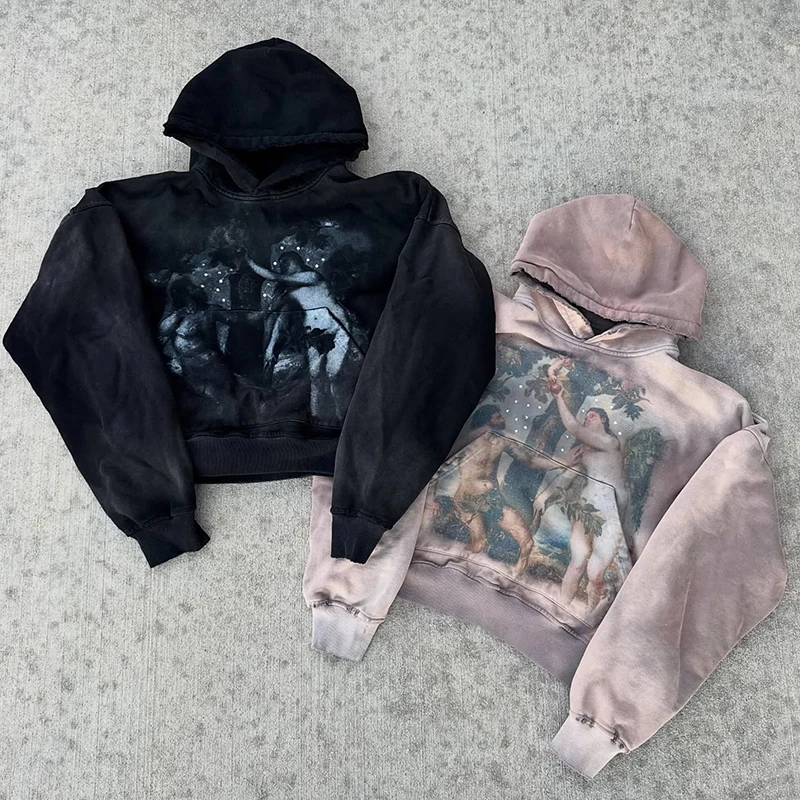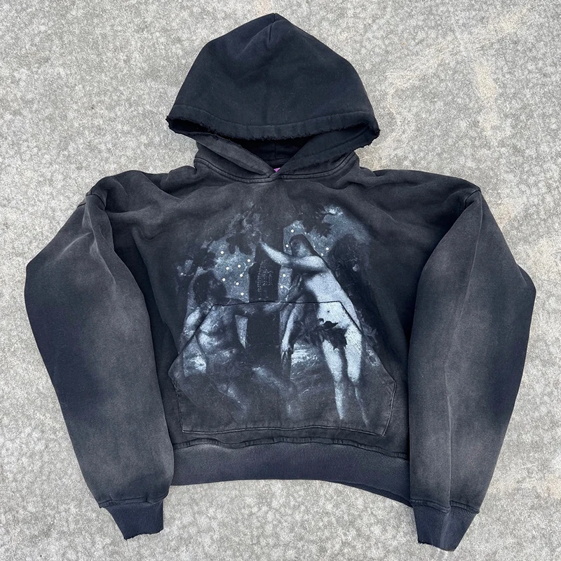 Vintage Distress Sun Faded Travel Drawstring Unisex Oversized Acid Washed Rhinestone Sweatshirt