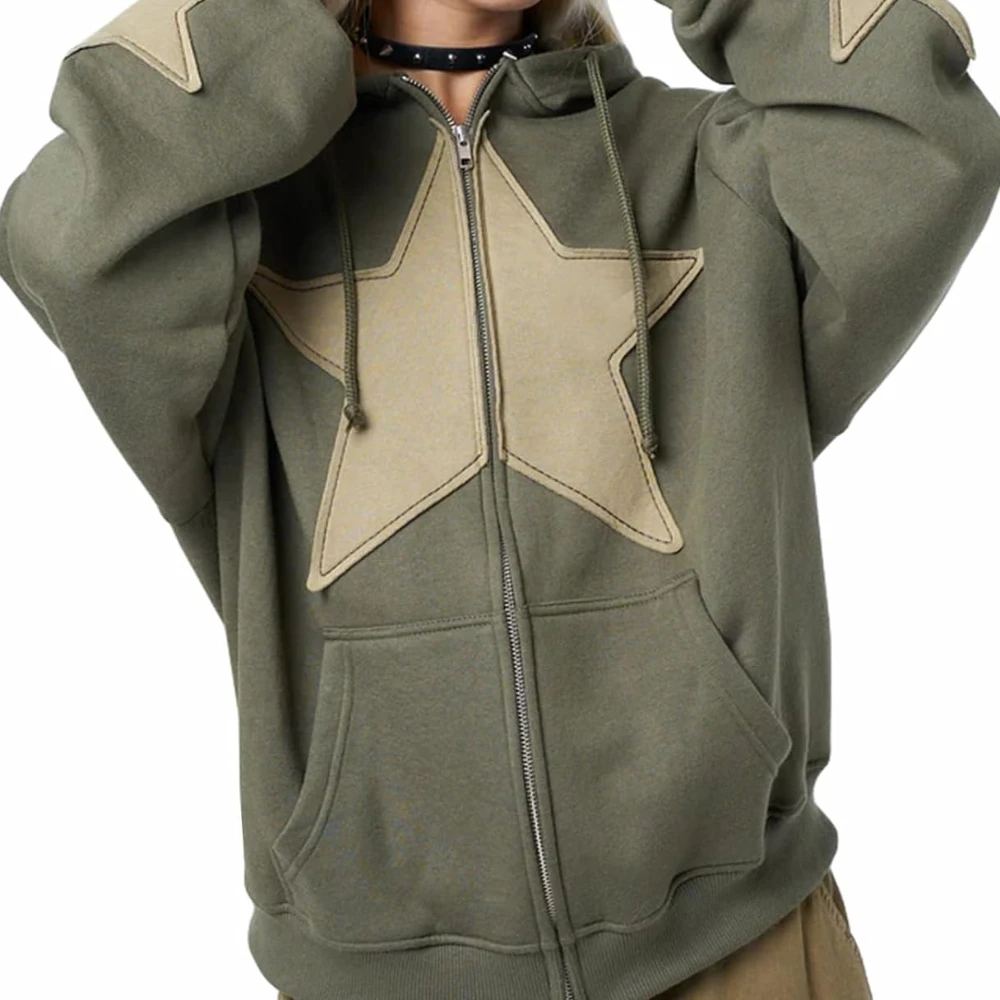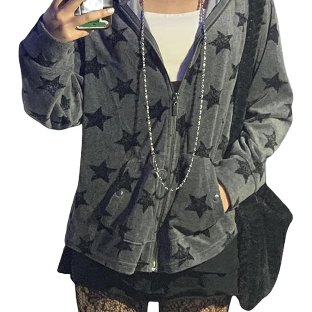 Y2K Streetwear Men’s Zip-Up Hoodie with Star Grunge Graphic Pullover Sweatshirt Letter Graphic for Women Harajuku Jacket Style